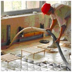 Da sie nicht begehbar ist, muss der Estrich von Trittböcken aus eingebracht werden.